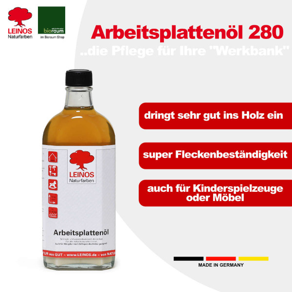 Bitte beachten Sie auch das aktuelle technische Merkblatt von Leinos zum Arbeitsplattenöl 280.