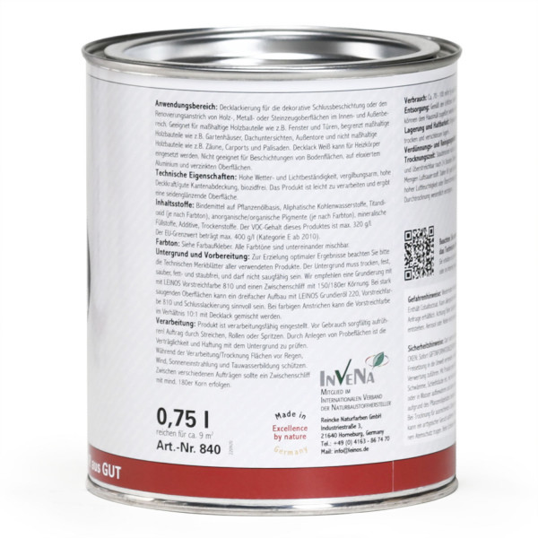 LEINOS 840 ist ein aromaten- und biozidfreier Decklack. Er hat eine hohe Wetter- und Lichtbeständigkeit, ist vergilbungsarm und eine hohe Deckkfraft. Er ist geeignet für die Lackierung von maßhaltigen Holzbauteilen wie z.B. Fenster und Türen, begrenzt maßhaltige Holzbauteile wie z.B. Gartenhäuser, Dachuntersichten, Außentore und nicht maßhaltige Holzbauteile wie z.B. Zäune, Carports und Palisaden. Decklack Weiß kann für Heizkörper eingesetzt werden. Nicht geeignet für Beschichtungen von Bodenflächen, auf eloxiertem Aluminium und verzinkten Oberflächen.