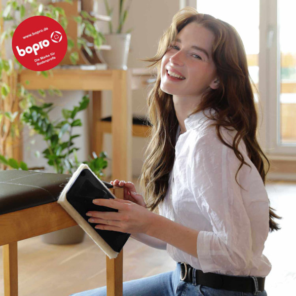 Der Padhalter hat einen Handgriff, um genau und sicher arbeiten zu können. Er ist für Reinigungspads, Massierpads sowie Polierpads im Format 250 mm x 115 mm geeignet. Auf der Unterseite befinden sich Noppen, auf die die Pads einfach aufgelegt werden können.
