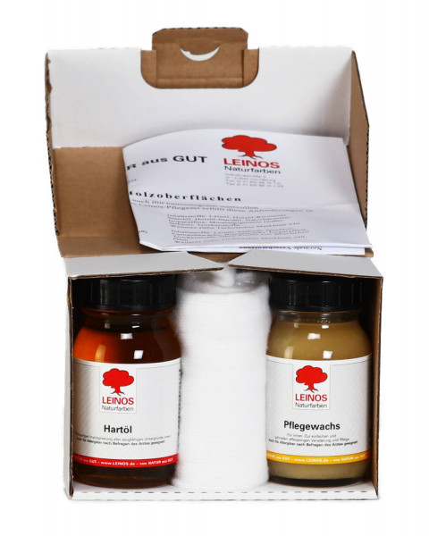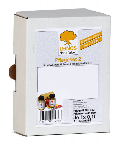 Das Pflege-Set beinhaltet das Pflegeöl 285 und die Pflanzenseife 930, jeweils in der Größe 0,1l. Es eignet sich zur Reinigung und Pflege von gewachsten und geölten Möbeloberflächen im Innenbereich.