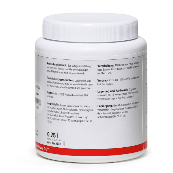 Bitte beachten Sie auch das aktuelle technische Merkblatt von Leinos zur Wachslasur auf Wasserbasis 600.